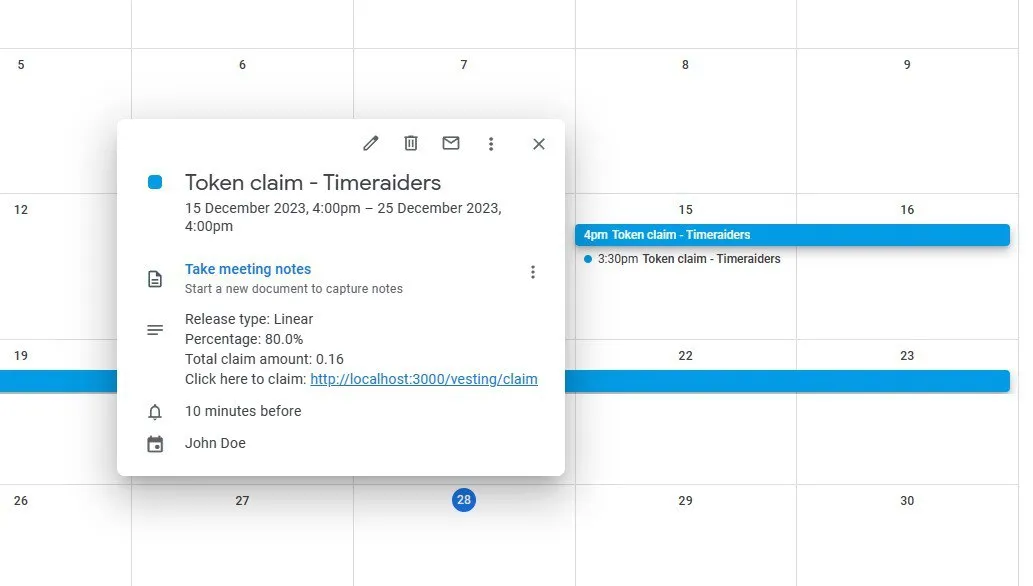 Users can now add project vesting schedules to their calendars with a click, enhancing the ease of tracking important dates. The feature works with various calendar services, displaying clickable links in Google Calendar and text details in others.